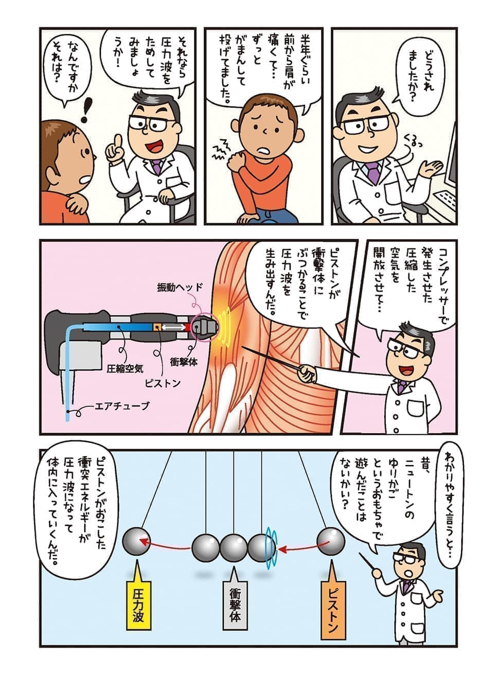 圧力波が伝わる仕組みは、「ニュートンのゆりかご」に例えられます。1つの金属球を引き、離すと、その球は静止した球へ向かって衝突して静止します。この瞬間、球がぶつかったのと反対の球は、最初の球と同じ速度で弧を描いて飛んでいきます。ショックマスターのピストンはこのエネルギーを伝える静止した球の役割を果たし、圧力波を発生させます。